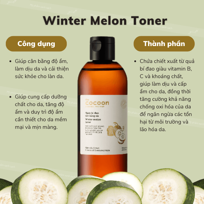 Toner bí đao Cocoon giúp làm sạch da và cân bằng da sau bước rửa mặt. Sản phẩm phù hợp sử dụng hằng ngày trong chu trình chăm sóc da.